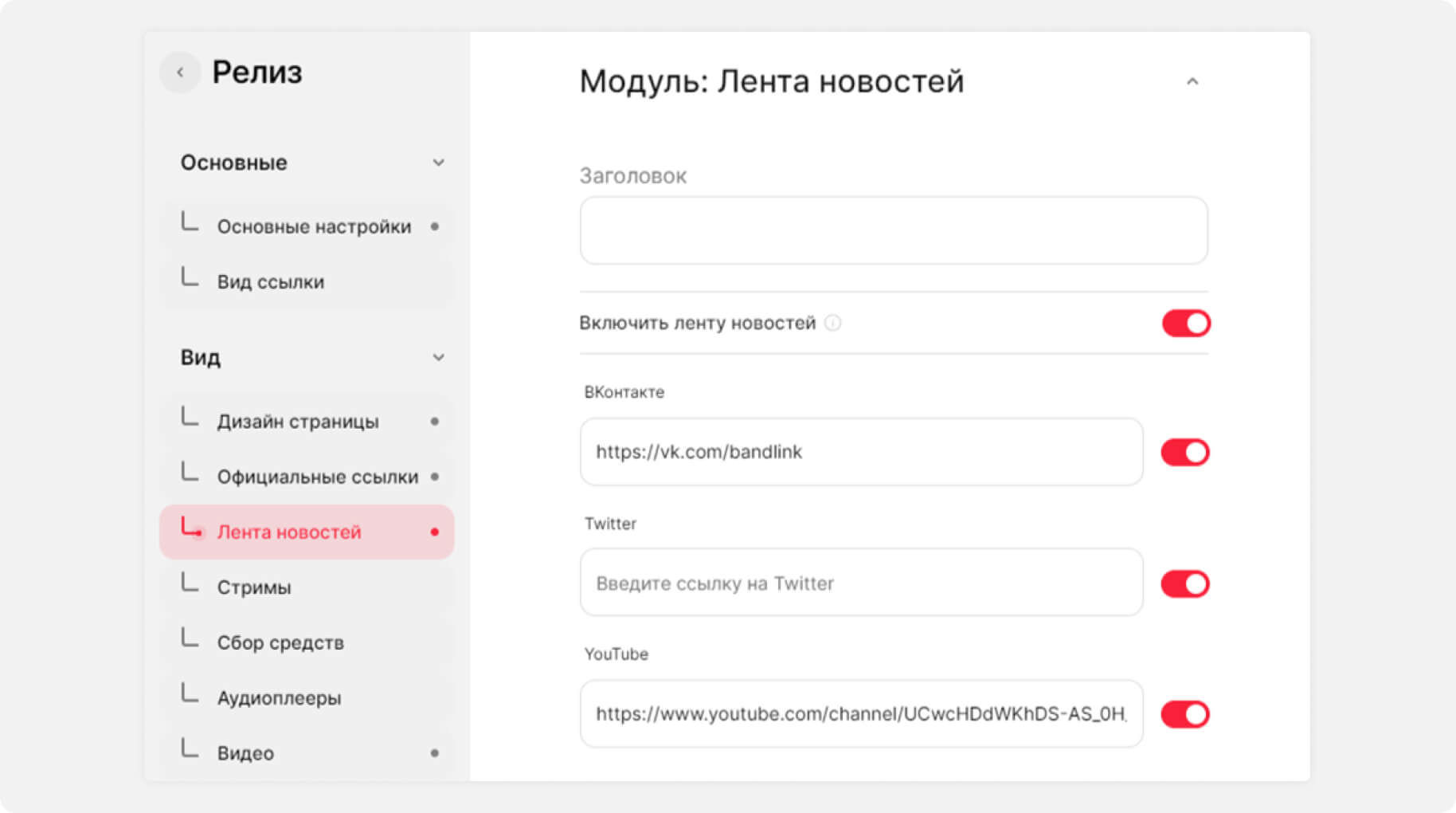 Данный модуль находится в разделе настроек «Вид» и позволяет отобразить на вашей странице BandLink ленту новостей, которая будет автоматически обновляться из ваших соцсетей.