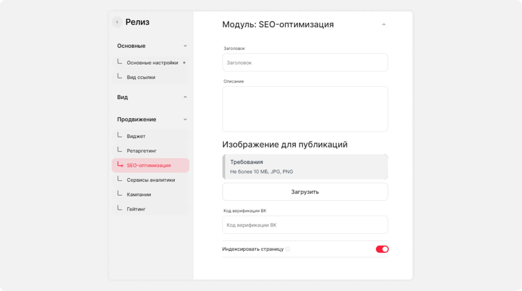 Данный модуль находится в разделе настроек «Продвижение» и позволяет настроить заголовок и описание страницы BandLink для предварительного просмотра ссылки в социальных сетях и лучшей поисковой оптимизации (SEO).