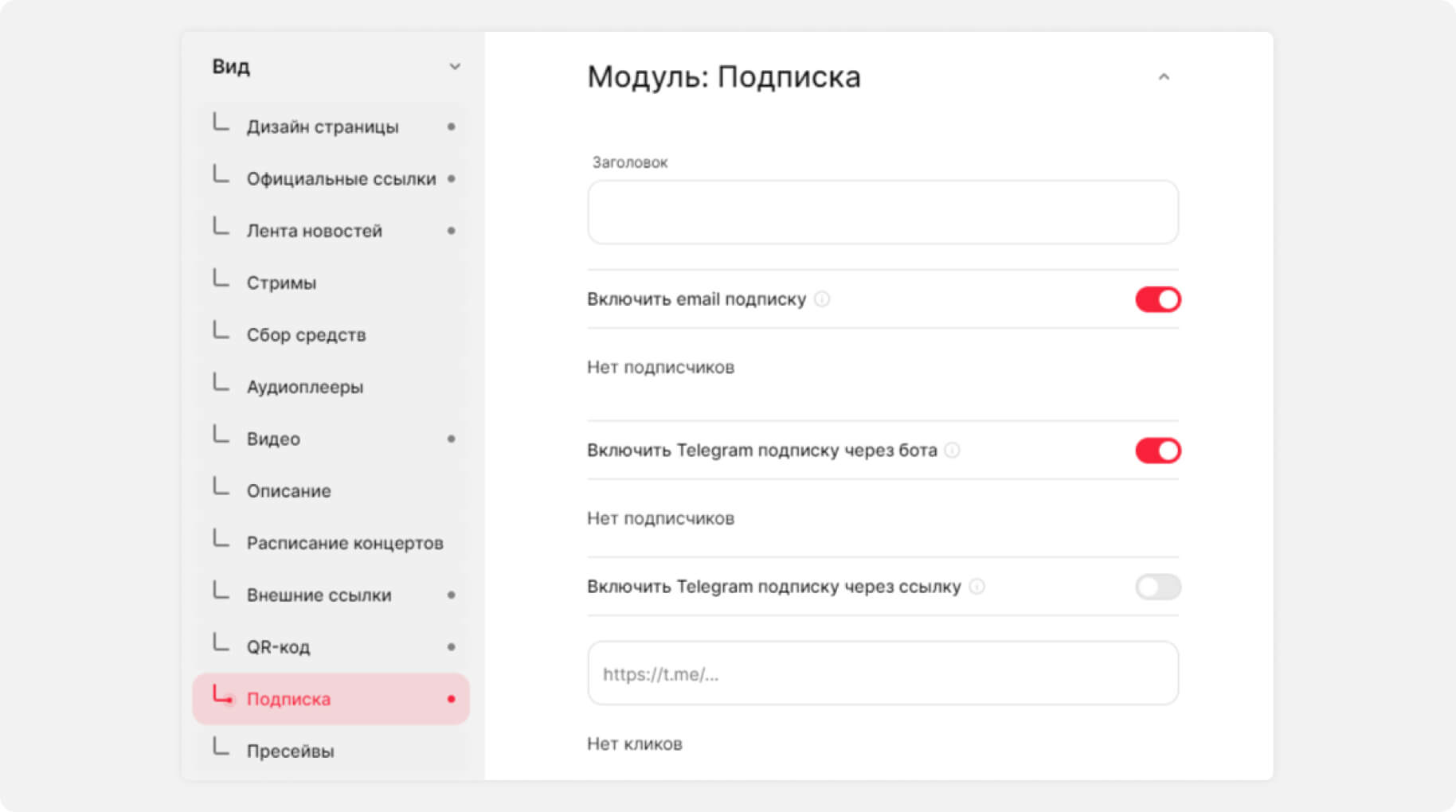 • С помощью кнопок включения/выключения добавьте модуль сбора email адресов или никнеймов в Telegram ваших фанатов. Вы можете использовать как один, так и оба канала для связи с аудиторией.