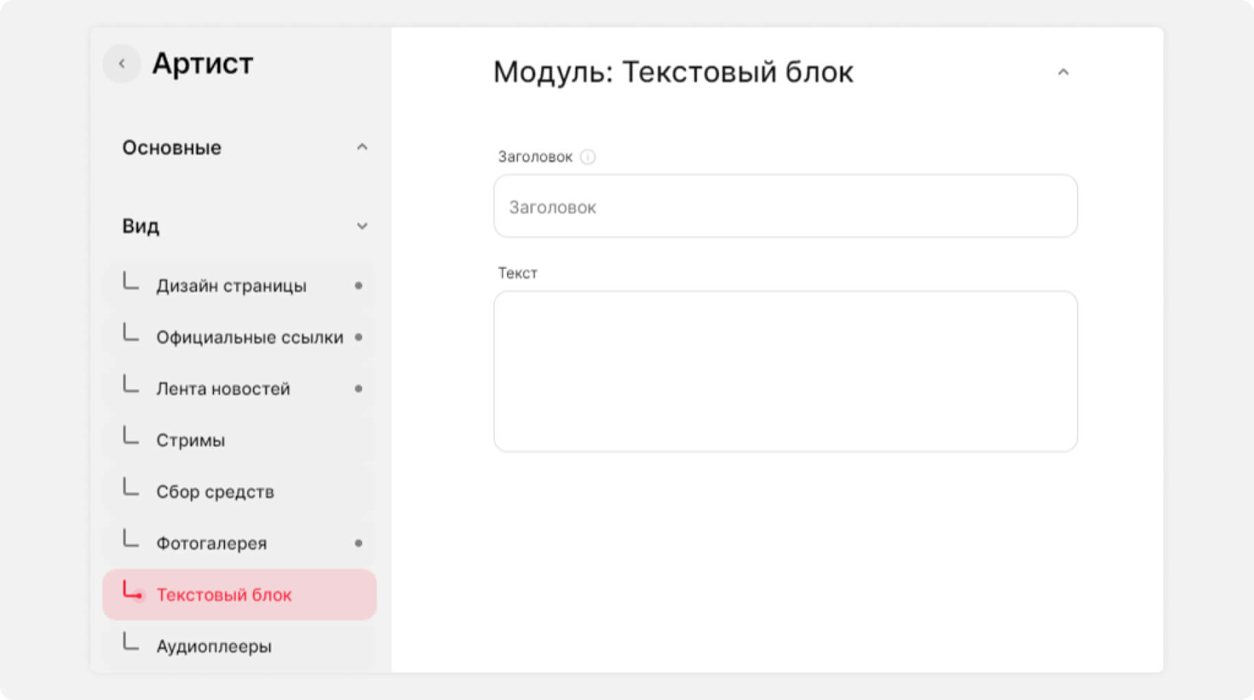 Этот модуль находится в разделе настроек «Вид» лишь у четырёх страниц BandLink: Артиста, Подкастера, Лейбла и Клуба.